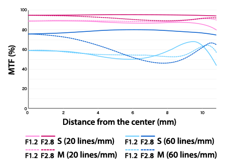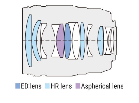 The three combined ED lenses can effectively correct the color overflow (axial color difference) and the image edge color overflow phenomenon of the extra-focus portion common to the large aperture lens by optimizing the installation position. In addition, the aspherical lens near the aperture and the four HR lenses can effectively suppress the appearance of coma aberration. For a medium telephoto lens, optimizing the position of the lens, successfully created a feather-like feminine blur effect and accurate high-sharp imaging performance under the maximum aperture setting.